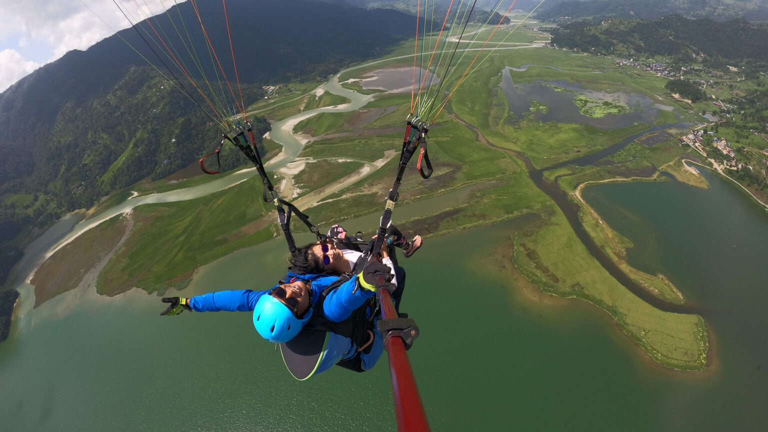 As you take off from the Sarangkot hill, suspended in a cocoon-like harness, the world below transforms into a breathtaking panorama. The Annapurna and Machapuchare mountain ranges stand tall on one side, while the serene Phewa Lake and lush landscapes unfold on the other. The feeling of gliding through the air, guided only by the wind and your expert pilot, is nothing short of surreal.